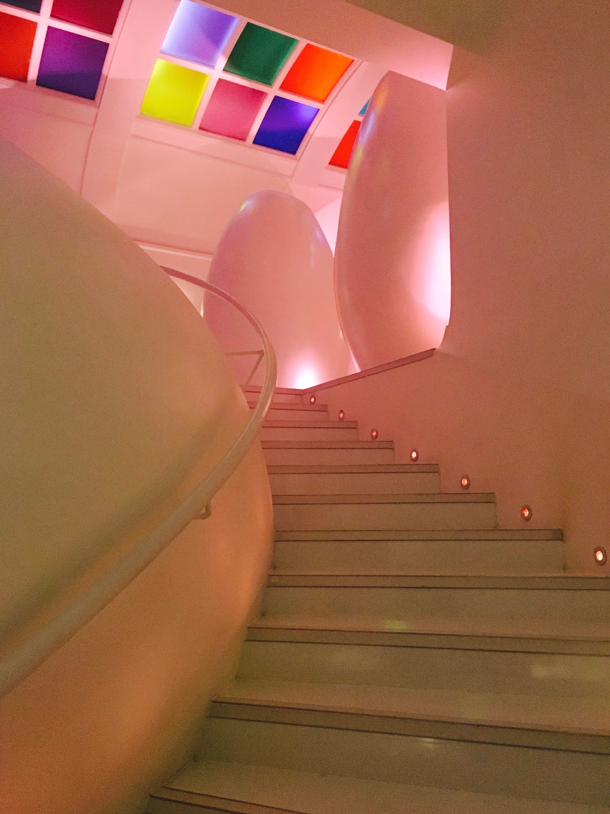 The individual cubicles shaped like eggs at the top of the staircase are space pod toilets.